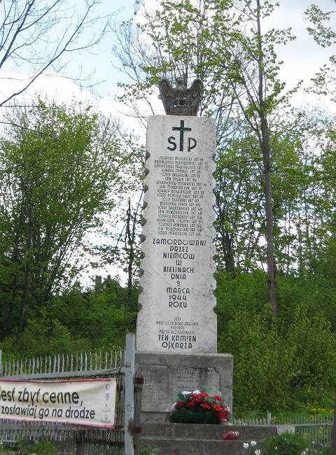 Pomnik ku czci pomordowanych w Bielinach, znajdujący się u podnóża wzgórza kościelnego, został wybudowany zaraz po wojnie i poświęcony ludziom, którzy oddali życie w walce o wolność. Głównym inicjatorem pomnika był Józef Ozga Michalski, a projektantami - doktor Oleś i konserwator zabytków Przybykowski, zaś wykonawcą fabryka marmurów w Kielcach. Widnieje na nim sentencja: "Jeśli pamięć ludzka zaginie - niechaj przed potomnymi ten kamień oskarża". Oprócz nazwisk poległych jest również stosowna treść: "Zamordowani przez Niemców w Bielinach 9 marca 1944 roku".