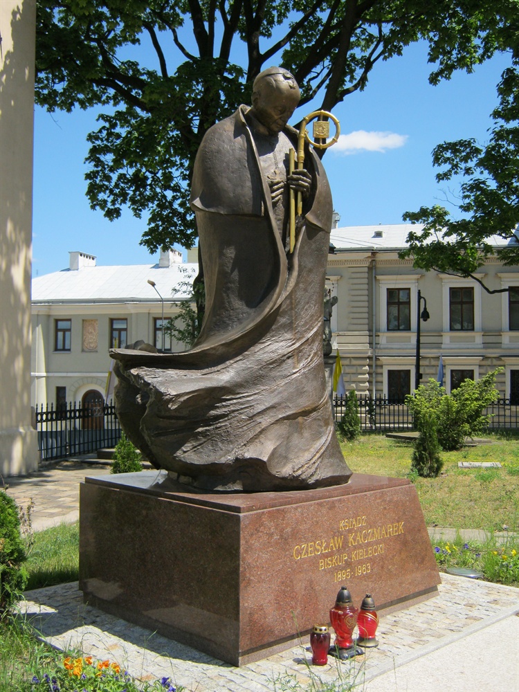Pomnik biskupa Czesława Kaczmarka (1895-1963) znajduje się obok katedry. Jest on poświęcony ordynariuszowi kieleckiemu prześladowanemu w PRL przez Urząd Bezpieczeństwa i skazanemu w pokazowym procesie na 12 lat. Autorem monumentu jest prof. Stanisław Słonina. Rzeźba biskupa kieleckiego wykonana jest z brązu. Uroczyste odsłonięcie nastąpiło 16 października 2010.