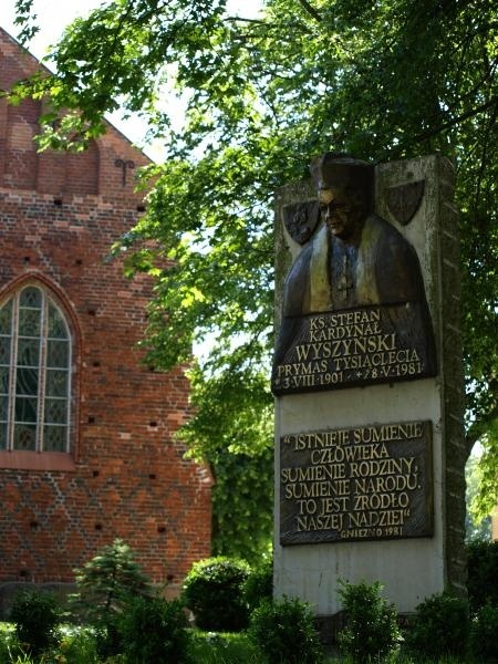 Pomnik księdza kardynała Stefana Wyszyńskiego usytuowany jest przy Kościele Mariackim pw. Wniebowzięcia NMP w Sławnie. Pomnik ma formę przestrzennej płyty, na której znajduje się wizerunek Prymasa Tysiąclecia. Autorem, a zarazem wykonawcą pomnika jest Zygmunt Wujek z Koszalina. Odlew wykonano w ludwisarni w Poznaniu. W górnej części pomnika znajdują się dwa medaliony przedstawiające orła piastowskiego i Matkę Boską z dzieciątkiem. W dolnej części pomnika umieszczona jest płyta z brązu z napisem: "Istnieje sumienie człowieka, sumienie rodziny, sumienie narodu. To jest źródło naszej nadziei - Gniezno 1981". Pod tym napisem mieści się kolejna płyta z napisami: "Mieszkańcy Sławna i duszpasterze parafii", oddzielonymi herbem miasta Sławno. Ofiarodawcami pomnika są: sławieńskie zakłady pracy, instytucje, prywatni przedsiębiorcy, parafianie, członkowie Parafialnego Oddziału Akcji Katolickiej, Róże Żywego Różańca, weterani wojskowi. Patronat nad budową pomnika przyjęli: Parafia Rzymskokatolicka pw. Wniebowzięcia NMP, starostwo sławieńskie, burmistrz miasta. Prace budowlane przy montażu wykonały sławieńskie firmy: Zakład „Hydrogeobudowa” i „Olszewski i Synowie”.