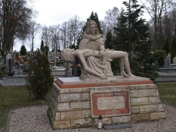 Pieta znajduje się na Cmentarzu Komunalnym przy kaplicy na ul. Gdańskiej. Odsłonięcie pomnika autorstwa Bogusława Migla nastąpiło 15 września 2000 roku. Uroczystość wśród wiernych celebrował ksiądz prałat Marian Dziemianko. Pieta przedstawia naturalnej wielkości postacie Matki Boskiej i Chrystusa. Figury wykonane z betonu zbrojonego, a cokół wysokości ok. 1 m, również z betonu zbrojonego, obłożono płytkami z piaskowca. Na cokole zamontowana została płyta z napisem: "Matka Boska Bolesna - replika z ołtarza papieskiego - Sopot 5 VI 1999". W 2002 roku rzeźba została podpalona, w późniejszym czasie dwukrotnie oblana smołą. Dzięki staraniom artysty i zarządcy Cmentarza Komunalnego rzeźba powracała do swojej pierwotnej formy. W 1999 roku Bogusław Migel wykonał oryginalną, drewnianą Pietę. Była ona jednym z kilkunastu elementów ołtarza papieskiego zaprojektowanego przez prof. Mariana Kołodzieja. Ołtarz stanął na sopockim hipodromie z okazji wizyty papieża Jana Pawła II w Polsce w czerwcu 1999 roku. Po zakończeniu papieskiej pielgrzymki rzeźby z sopockiego ołtarza przeniesiono do Sanktuarium w Matemblewie. Drewnianą replikę sławieńskiej Piety, wielkości kilkudziesięciu centymetrów, w 2006 roku przekazano papieżowi Janowi Pawłowi II. Dar od mieszkańców Sławna przekazała papieżowi osobiście delegacja z Cles (włoskie miasto partnerskie Sławna).