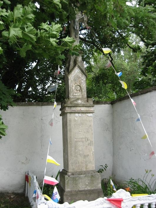 W Rudzie Kościelnej, naprzeciw drewnianego kościoła, stoi kamienny krzyż z 1907 roku ufundowany przez Józefę Wisoską ze Stoków, zapewne w dowód jakiegoś podziękowania. O tej porze roku krzyż jest słabo widoczny, bo przykrywają go gałęzie drzew z pobliskiego parku podworskiego, w którym można obejrzeć XVIII-wieczny dwór. Na krzyżu znajduje się napis: "Na cześć i chwałę Panu Bogu tę figurę wystawiła Józefa Wisoska ze Stoków wraz z dziećmi. 1907".