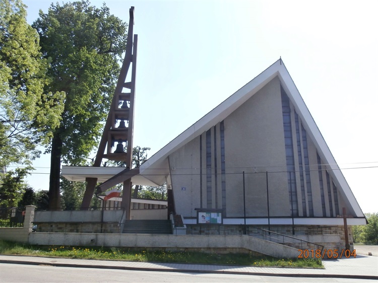 Kościół został wybudowany w latach 1972-1978 wg projektu Antoniego Mazura, co widać po kształcie budowli. Jest bardzo podobna do pozostałych trzech innych kościołów autorstwa tego projektanta (Kościół Zmartwychwstania Pańskiego, Kościół św. Antoniego Padewskiego, Kościół Stygmatów św. Franciszka). Charakterystycznymi elementami są stromy, dwuspadowy dach i ażurowa wieża. W środku rzuca się w oczy mozaika usytuowana za ołtarzem. Warto zwrócić uwagę na witraże Michała Jakubasa.