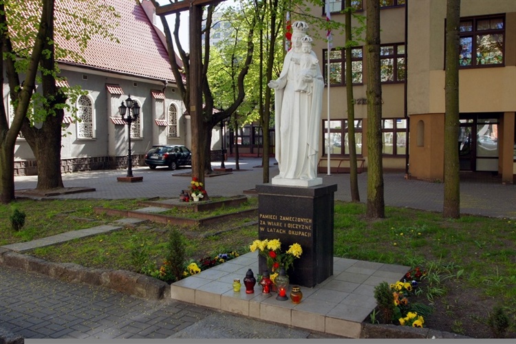 Na terenie placu przed kościołem NMP Królowej Polski, bliżej ul. Armii Krajowej, stoi figura NMP z dzieciątkiem Jezus. Na cokole pomnika widnieje napis: „Pamięci zamęczonych za wiarę i ojczyznę w latach okupacji".