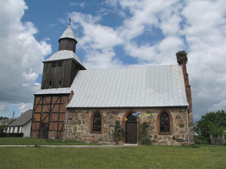 Kościół pw. Matki Bożej Pocieszenia w Nowej Dąbrowie wzniesiono pod koniec XV wieku z kamienia polnego i cegły, w stylu późnego gotyku. Jest to budowla salowa, na planie prostokąta, pierwotnie bez wieży. Obecną wieżę o konstrukcji szachulcowej wybudowano w połowie XVIII wieku. W XIX wieku częściowo przebudowano kościół, w ścianę południową, obok głównego wejścia, została wmurowana tablica poświęcona mieszkańcom wsi poległym w I wojnie światowej. Na kościele znajduje się bocianie gniazdo.