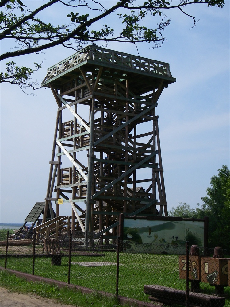 Drewniana wieża widokowa znajduje się przy Muzeum Słowińskiego Parku Narodowego w Rąbce (około 6 km od centrum Łeby). Z jej tarasów można podziwiać panoramę na Jezioro Łebsko. Choć turyści chętnie wchodzą na wieżę, aby podziwiać widoki i robić piękne zdjęcia, to nie do końca dla nich została ona tutaj postawiona. Służy do monitoringu przeciwpożarowego, ale korzystają z niej również pracownicy parku, którzy mają możliwość obserwacji i ochrony siedlisk niektórych gatunków.