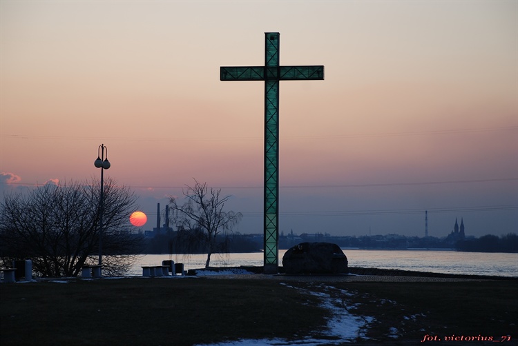 Krzyż upamiętnia śmierć męczeńską ks. Jerzego Popiełuszki. Zrobiony został przez pracowników firmy "Zakłady Azotowe Włocławek", obecnie firma "Anwil", na wizytę pielgrzymkową Jana Pawła II. Zamontowano go na pobliskim lotnisku Kruszynie, gdzie papież odprawiał mszę świętą. Po pielgrzymce przeniesiono poświęcony krzyż na miejsce śmierci ks. Jerzego Popiełuszki i stoi do dzisiaj przy zaporze wodnej we Włocławku. Jest to symbol przypominający wszystkim o bestialskim mordzie wykonanym na kapelanie "Solidarności" przez oficerów SB 19 października 1984 roku. W roku 2010 wykonano nową iluminację krzyża.