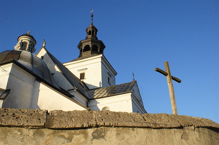 Kościół został zbudowany na planie krzyża greckiego, w XVIII wieku dobudowano do niego późnobarokowe kaplice. Wnętrze wyposażone jest w rokokowy ołtarz główny z wmontowanym obrazem Matki Bożej z Dzieciątkiem, który to został uznany za cudowny, słynący łaskami - pochodzi z XVI wieku. Wnętrze zdobią również barokowe rzeźby Chrystusa Zmarwychwstałego oraz św. Sebastiana. Na uwagę zasługują także rokokowe ambona i chór muzyczny oraz barokowe, marmurowe epitafium Jakuba i Barbary Kosteckich z 1634 roku.