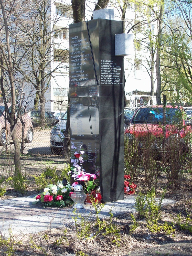 Pomnik pomordowanych redemptorystów i mieszkańców Woli znajduje się przy ulicy Wolskiej, po drugiej stronie ulicy, naprzeciwko kościoła św. Wojciecha. Monument jest poświęcony zamordowanym w dniu 6 sierpnia 1944 roku 30 zakonnikom klasztoru redemptorystów przy Karolkowej i około dwóm tysiącom mieszkańców Woli. W klasztorze przy ulicy Karolkowej został utworzony punkt powstańczy. Ojcowie przenieśli się do piwnic, udzielając pomocy i schronienia okolicznym mieszkańcom. W dniu 5 sierpnia 1944 roku, ze względu na tragiczną sytuację oddziałów powstańczych na Woli, powstańcy wraz z dowództwem wycofali się na Stare Miasto. W nocy około 3.00 godz. Niemcy otoczyli klasztor, wypędzając z niego wszystkich tam przebywających i kierując ich do kościoła św. Wojciecha, który był przemianowany na obóz przejściowy. Zakonnicy od razu zostali oddzieleni oraz wyprowadzeni na niewielki plac fabryki Kichmayera i Marczewskiego i tam rozstrzelani w tył głowy. Następnie przeprowadzono tam egzekucję ludności cywilnej. Monument mierzy 2,5 metra i jest wykonany z granitu. Stella nawiązuje do postaci redemptorysty w czarnym habicie, który jest przepasany trokiem z różańcem. W symboliczny blok wtopiony jest biały krzyż. Na pomniku jest wyryty napis: „Pamięci 30 zakonników redemptorystów i około 2 tysięcy mieszkańców Woli zamordowanych przez Niemców w fabryce Kichmayera i Marczewskiego w dniu 6 sierpnia 1944 roku. Pozostali wierni Bogu, Kościołowi i Ojczyźnie”. W dolnej części zostały umieszczone nazwiska wszystkich zamordowanych zakonników. Monument odsłonięty został 11 września 2010 roku.
