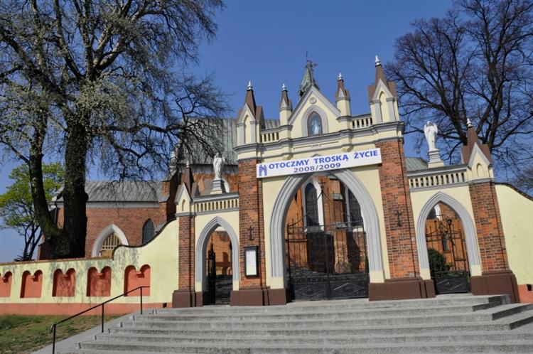 Kościół parafialny pw. Wniebowzięcia NMP. Wzniesiony został w XV w. w stylu gotyckim. Murowany z cegły. Elewacje wschodnie i zachodnie nawy zwieńczone szczytami wczesnobarokowymi z XVII w.