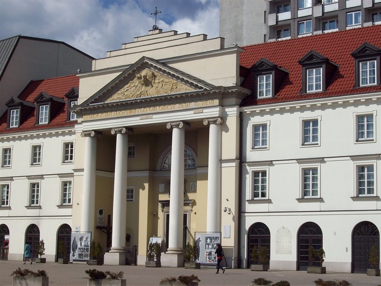 Historia kościoła w tym miejscu sięga początku XVIII wieku, kiedy to z fundacji prymasa Teodora Potockiego została wybudowany klasztor wraz z małym kościołem pw. Świętego Krzyża dla oo. Jezuitów z Rawy Mazowieckiej. W 1774 roku klasztor uległ kasacie, a świątynia stała się kościołem parafii św. Andrzeja. W 1817 roku w zamian za zabrany Marwil, pod budowę Teatru Wielkiego, Kanoniczki otrzymały kościół wraz zabudowaniami. W 1819 roku nastąpiła przebudowa według projektu Christiana Piotra Aignera. Świątynia należała do Kapituły Dam Świeckich tego zakonu. Panny Kanoniczki były wspólnotą wdów i panien, które nie posiadały rodzin, ale chciały powadzić bogobojne życie. Panna kanoniczką mogła zostać tylko kobieta, która od przynajmniej trzech pokoleń wywodziła się z rodu arystokratycznego z obu stron. W czasie okupacji hitlerowskiej kościół uległ częściowemu zniszczeniu. W 1953 roku władze zdecydowały się na rozebranie ruin świątyni i wybudowały na części terenu kościelnego blok mieszkalny. Świątynia przy Placu Teatralnym 18 została dopiero odbudowana w latach 1989-90 jako Kościół Środowisk Twórczych pw. Św. Brata Alberta i św. Andrzeja Apostoła. Zrekonstruowana została fasada, a budynek kościelny ze wzglądu na znajdujący się blok przy ulicy Daniłowiczowskiej, został skrócony. W dniu 13 czerwca 1999 roku aktu poświęcenia dokonał papież Jan Paweł II. Na froncie budynku pod tympanonem zostały umieszczone wersy z ewangelii, które zostały wypowiedziane przez Jana Pawła II podczas mszy na pl. Piłsudskiego w 1979 roku „Niechaj zstąpi duch Twój i odnowi oblicze ziemi, tej ziemi”. W 2004 roku w tympanonie kościoła została umieszczona płaskorzeźba autorstwa prof. Gustawa Zemły.