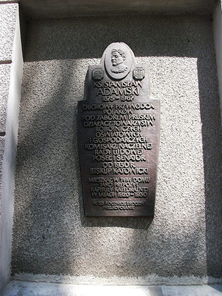 Stanisław Adamski (1875-1967) to biskup diecezji katowickiej w latach 1930-1967. Zanim trafił do Katowic, mieszkał i działał w Wielkopolsce m.in. jako prepozyt kapituły katedralnej w Poznaniu w latach 1920-1930. Był również aktywnym społecznikiem, działaczem wielu polskich organizacji. Spośród wielu funkcji należy wymienić następujące: sekretarz Związku Katolickich Towarzystw Robotników Polskich, członek zarządu Towarzystwa Czytelni Ludowych i patron Związku Spółek Zarobkowych i Gospodarczych po śmierci ks. Wawrzyniaka.