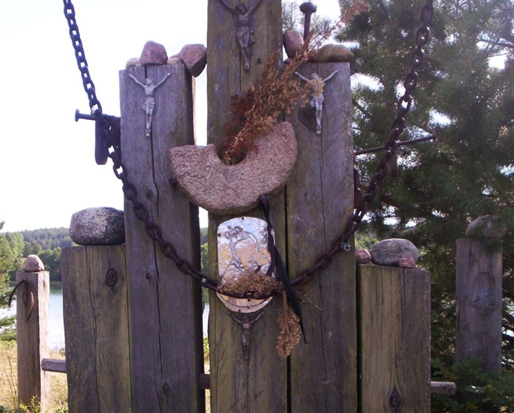 Na wysokim brzegu Zatoki Krzyżańskiej (południowo-wschodnia zatoka Jeziora Wigry) stanął pomnik projektu Gustawa Zemły i Zdzisława Jaroszka. Pomnik jest nietypowy i bardzo sugestywny. Przedstawia wysoki, kilkunastometrowy krzyż otoczony przez przymocowane do siedmiu grubych pniaków, autentyczne elementy wyposażenia chałup i wiejskich gospodarstw. Wśród przedmiotów codziennego użytku zobaczyć możemy ocalałe z pożogi kamienie żarnowe, sierpy, kosy, podkowy, łańcuchy… wszystko to robi naprawdę niesamowite wrażenie.