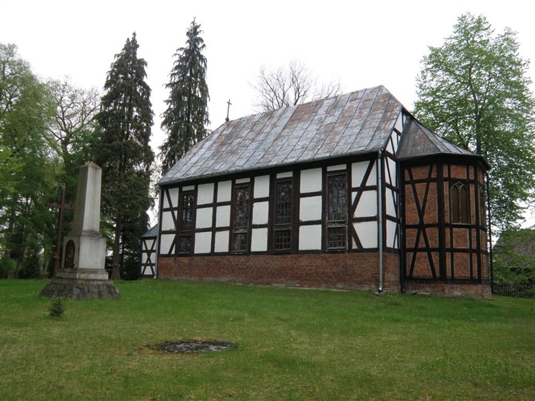 Ma duże, charakterystyczne dla protestanckich świątyń okna. Gwarantowały one odpowiednie doświetlenie wnętrza przedzielonego długimi ciągami empor. Po wojnie balkony zostały skrócone. Całe wnętrze dostosowano do potrzeb obrządku katolickiego. Przebudowany w 1998 roku przedsionek kościoła całkowicie współgra z jego bryłą i wydaje się być oryginalnie ryglowy (ale jedynie taką konstrukcję udaje).