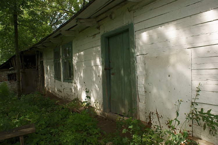 Stara, drewniana chata kielecka z początku XX wieku. Przykład budownictwa drewnianego charakterystycznego dla tego regionu. Chata kryta dwuspadowym dachem, ściany o konstrukcji sumikowo-łątkowej z pionowymi słupkami ustawionymi na belce podwalinowej, przestrzenie pomiędzy słupkami wypełnione poziomymi belkami wsuniętymi w bruzdę słupka. Od góry konstrukcję ściany stęża oczep, belka pozioma połączona ze słupkami na czopy, na której wspiera się konstrukcja więźby dachowej. Domostwa takie kryte były dawniej strzechą, tutaj widać już nowy materiał pokryciowy w postaci płyt fałdowych.