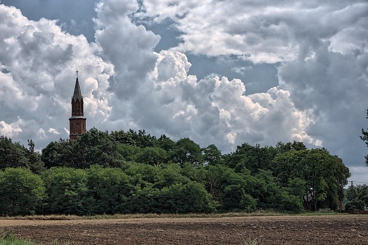 Kościół wzniesiony z czerwonej cegły w 1876 roku w stylu neogotyckim. Bardzo wysoka smukła wieża jest widoczna z kilku kilometrów nawet z drugiej strony Noteci.