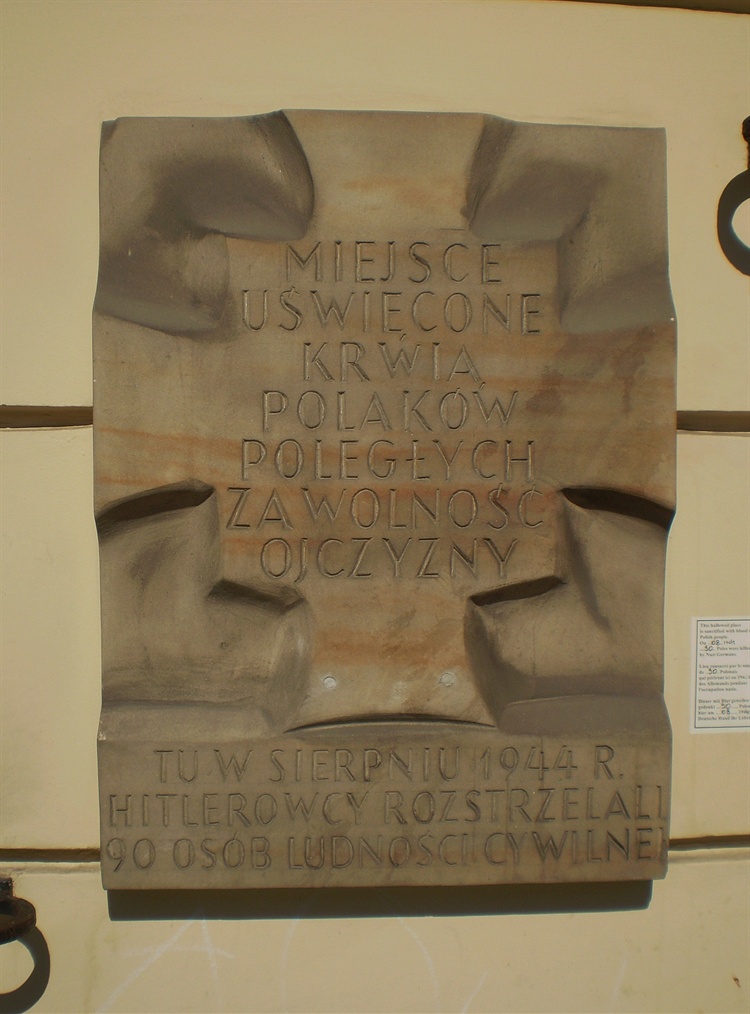 Jest to tablica z piaskowca, która znajduje się na narożu kamienicy Augusta Stola, od strony Alei Jerozolimskich. Upamiętnia wydarzenia z sierpnia 1944 r., kiedy to w pobliżu tego miejsca Niemcy rozstrzelali 90 osób ludności cywilnej.
