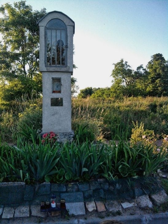 Jest to przydrożna kapliczka murowana (pierwotnie drewniana), otynkowana, z nietypowym, półkolistym dachem, z górną częścią szerszą od podstawy. Fundatorem kapliczki była miejscowa rodzina grecka. Postawienie pierwszej kapliczki w tym miejscu datuje się na początek XVIII w. jako wotum dziękczynne za przeżycie zarazy po wojnie północnej. Jej patronem jest św. Roch, którego atrybutem jest pies. Figura świętego datowana jest na początek XVIII w., a psa na początek XIX w. Poniżej świętego znajduje się mała wnęka z barokową figurką Matki Boskiej Bolesnej datowana na koniec XVII w. W 1891 r. grunty od bezdzietnej rodziny Greków kupili Marianna i Wojciech Leitbergowie, którzy zobowiązali się do opieki nad kapliczką. W 1939 r. ich córka, Weronika Hinch, ukryła figurkę św. Rocha, a kapliczka z figurką Matki Bożej została wysadzona przez Niemców.