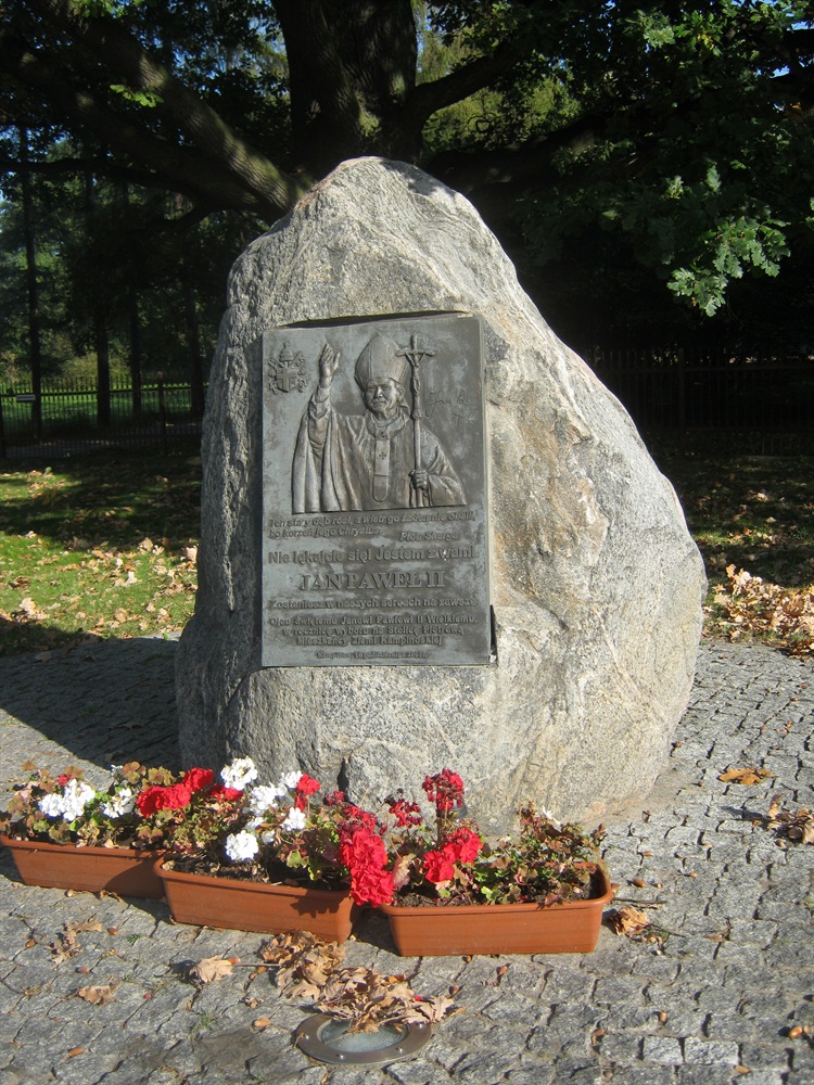 Pomnik Jana Pawła II znajduje się w sąsiedztwie dębów Stefan i Fryderyk, nieopodal mieszczącego się po drugiej stronie ulicy kościoła parafialnego Wniebowzięcia NMP. Uroczyste odsłonięcie pomnika nastąpiło w przededniu Dnia Papieskiego w październiku 2005 roku. Tablica umieszczona jest na głazie, a na niej znajduje się wizerunek Jana Pawła II, słowa z homilii: „Nie lękajcie się, jestem z Wami”, które zostały wygłoszone w Warszawie podczas pierwszej pielgrzymki w 1979 roku do Polski, cytat Piotra Skargi z Kazań Sejmowych: „Ten stary dąb rósł, a wiatr go żaden nie obalił, bo korzeń jego Chrystus” oraz dedykacja mieszkańców Ziemi Kampinowskiej. Autorem tablicy jest Hanna Rożkiewicz-Tokarska, a wykonał ją artysta rzeźbiarz Tadeusz Kubiak. Tutaj, przed pomnikiem, 2 kwietnia o godzinie 21.37, w rocznicę śmierci papieża Jana Pawła II, oraz 16 października, w rocznicę wyboru na Stolicę Piotrową, mieszkańcy Kampinosu i okolic spotykają się na wspólnej modlitwie.