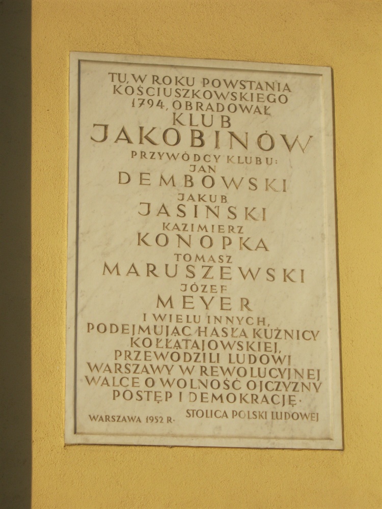 Tablica pamięci przywódców Klubu Jakobinów usytuowana jest na fasadzie Pałacu Ministra Skarbu przy Placu Bankowym 3/5. Upamiętnia ona przywódców Klubu Jakobinów - Jana Dembowskiego, Jakuba Jasińskiego, Kazimierza Konopkę, Tomasza Maruszewskiego i Józefa Meyera, którzy w tym gmachu w 1794 roku obradowali podczas powstania kościuszkowskiego, w którym odegrali znaczną rolę.