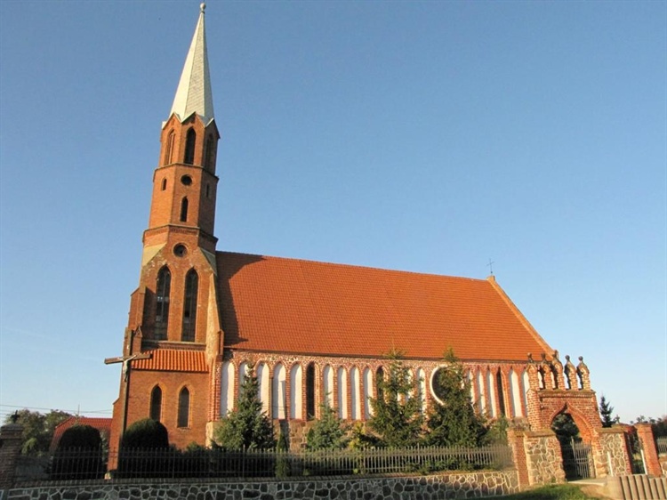 Kościół pw. Matki Boskiej Szkaplerznej w Raduniu został wzniesiony prawdopodobnie na przełomie XIII i XIV wieku, podczas przechodzenia ze stylu romańskiego w styl gotycki, o czym świadczą bogate, wczesnogotyckie dekoracje świątyni, m.in. ostrołukowe blendy znajdujące się na zewnętrznych ścianach świątyni. Jest to budowla salowa, na planie prostokąta, pierwotnie bez wieży, wybudowana z kamienia i czerwonej cegły. W drugiej połowie XIX wieku kościół został przebudowany, na miejscu wcześniejszej drewnianej wieży wzniesiono strzelistą, neogotycką wieżę z cegły. Po II wojnie światowej kościół był kilkakrotnie remontowany i odnawiany. We wnętrzu mieści się późnobarokowy ołtarz oraz XVII-wieczny dzwon, natomiast w otaczającym kościół kamiennym murze znajduje się zabytkowa bramka z cegły ceramicznej.