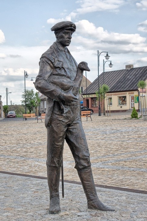 W dawnych latach Ślesin słynął z wielkich hodowli gęsi i był lokalnym centrum handlu nimi. Kupione gęsi były pędzone przez Wielkopolskę do Niemiec. Przed wyjściem gęsi były podkuwane, przechodziły przez płynną smołę, a później przez pierze. Tak zabezpieczone gęsie nogi były bardziej odporne na kontuzje. Fontanna składa się z dwóch elementów. Pierwszym jest trzypoziomowa fontanna, na szczycie której znajduje się figurka gęsi, z której dziobu tryska woda. Drugim elementem jest handlarz niosący gęś pod pachą.