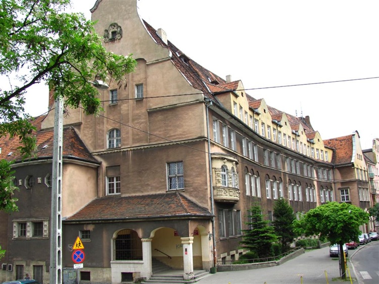 Zabytkowy, monumentalny gmach szkolny, wzorowany na barokowym budownictwie Niemiec i Anglii, zbudowany został na pocz. XX w. wg projektu Hermanna Herrenberga. Obiekt składa się tylko z gmachu głównego, gdyż pozostałe obiekty m.in. skrzydło niższe, sala gimnastyczna nie zostały zrealizowane. Budynek posiada bogato dekorowane szczyty, ciekawe detale architektoniczne oraz wykusz z gabinetem dyrektora. Na elewacji znajdują się płaskorzeźby europejskich bajek, jest tu n.p. Czerwony Kapturek oraz Jaś i Małgosia.