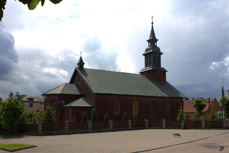 Drewniany kościół pw. MB Różańcowej wzniesiony został w latach 1902-1906. Jest budowlą jednonawową, z wieżą osadzoną na nawie i dachem krytym blachą. Wyposażenie wnętrza jest starsze i pochodzi częściowo z rozebranych wcześniej obiektów sakralnych: kościoła w Wielu i kaplicy w Odrach. Poświęcenia kościoła dokonał proboszcz parafii z Wiela w dn. 30 września 1906 roku. Wewnątrz świątyni warto zwrócić uwagę na barokowy ołtarz i konfesjonał, klasycystyczną chrzcielnicę i ambonę oraz ciekawą polichromię wykonaną przez chełmińskiego malarza Antoniego Piotrasa.