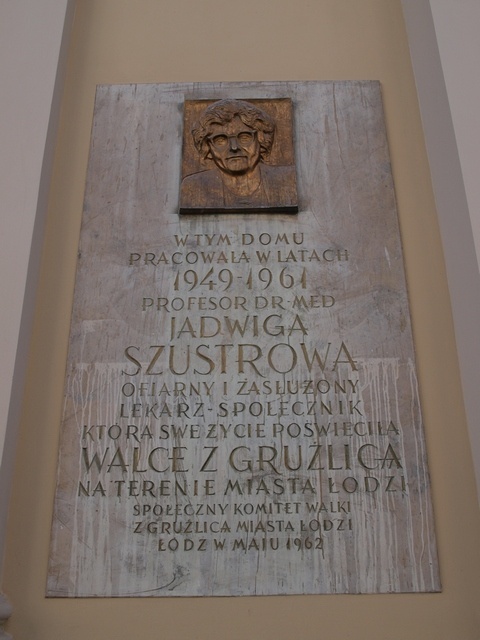 Profesor dr med. Jadwiga Szustrowa urodziła się w roku 1890. Była lekarzem społecznikiem, która całe swoje życie i wykształcenie medyczne poświęciła walce z gruźlicą. W latach 1949-1961 pracowała w budynku przy ulicy Moniuszki 7/9. Tam też, na froncie budynku, znajduje się pamiątkowa tablica upamiętniająca postać pani profesor. Jadwiga Szustrowa zmarła 14 maja 1961 roku. Została pochowana na Cmentarzu na Dołach.