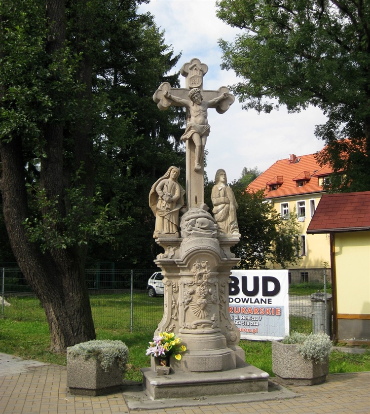 Przy ulicy J. Dąbrowskiego, na prawym brzegu Bystrzycy Dusznickiej, stoi kamienna Grupa Figuralna "Ukrzyżowanie". Na postumencie o późnobarokowych formach umieszczony jest krzyż z figurą Chrystusa ufundowany w 1819 r. przez Antoniego Kusela, bogatego chłopa z Jaszkowej Dolnej. Pod krzyżem znajdują się figury Matki Boskiej Bolesnej i św. Jana Apostoła. Dwadzieścia kilka lat temu w niewyjaśnionych okolicznościach zniknęła figura św. Jana Apostoła. Staraniem Towarzystwa Miłośników Polanicy, burmistrza oraz radnych została odtworzona brakująca figura przez polanickiego kamieniarza Leszka Stefańskiego. Obok krzyża mieści się kamienna tablica, na której widnieje napis: „Zrekonstruowano dzięki staraniom TMP, Burmistrza, Rady Miejskiej Polanicy Zdrój w 11. rocznicę Wielkiej powodzi 22 VII 1998. Polanica Zdrój 22 VII 2009”.