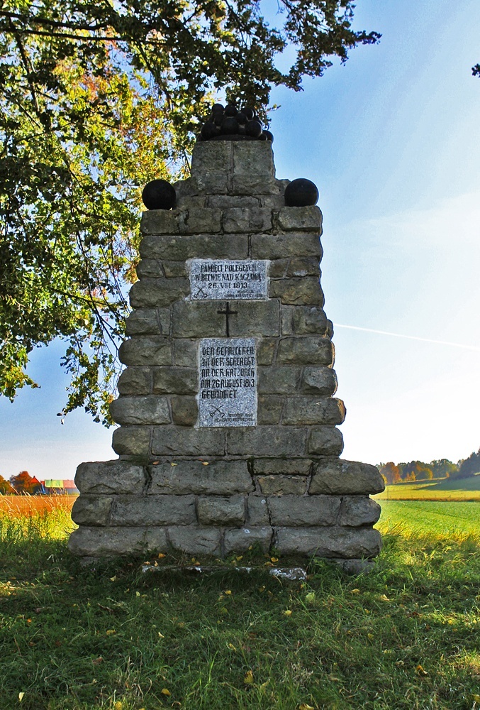 Pierwotnie ten kamienny obelisk odsłonięty został 21 maja 1908 r., a upamiętnia żołnierzy poległych w Bitwie nad Kaczawą, która odbyła się w 1813 r. pomiędzy wojskami napoleońskimi a armią rosyjsko-pruską. Po okresie wojennym, czyli po 1945 r. pomnik mocno zniszczono. Niedawno przeszedł renowację, dzięki której odzyskał tablice z napisami w czterech językach - polskim, francuskim, rosyjskim i niemieckim - oraz zdobiące go uprzednio kule armatnie. Ponownie został odsłonięty 23 sierpnia 1996 r. Obelisk stoi na wale w pobliżu połączenia się dwóch rzek - Nysy Szalonej i Kaczawy.