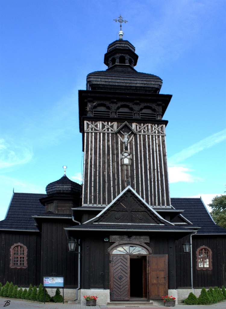 Źródła historyczne milczą na ten temat. Wiadomo jednak, że obecny drewniany kościół wzniesiony został w 1726 roku i jest kolejną już świątynią wybudowaną w tym miejscu. Powstał dzięki staraniom Marcina Romieńskiego - ówczesnego proboszcza tutejszej parafii. Jest budowlą jednonawową, orientowaną, konstrukcji zrębowej. Na początku XX wieku kościół powiększono, wydłużając nawę. Dobudowano również wieżę i dwie kaplice, które zostały ustawione symetrycznie po bokach nawy, tworząc w ten sposób pozorny transept.