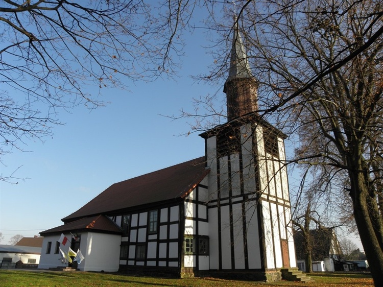 Sama wieś jest nieco starsza. Pierwsza wzmianka o niej pochodzi z 1337 r. i prawdopodobnie także już w XIV w. istniała tu świątynia. Na jej miejscu wybudowano w latach 1708-09 nowy kościół. Zajął się tym majster Adam Kinitz z Barlinka. Wewnątrz zachowała się inskrypcja z jego nazwiskiem i datą budowy. Początkowo kościół nie posiadał wieży. Dobudowano ją w 1780 r., a później dodatkowo podwyższono o latarnię zwieńczoną strzelistym hełmem. W wieży zachowały się dwa dzwony z pierwszej połowy XVIII w. (jeden być może nawet XVII-wieczny), a w kościele – cenny ołtarz w formie tryptyku fundowany przez von Schöningów z Janczewa. Wykorzystano w nim wcześniejsze, XVI-wieczne rzeźby.