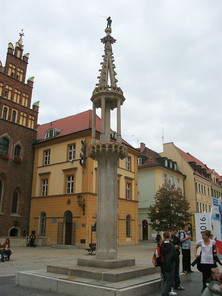 Stojący dzisiaj przed wrocławskim ratuszem pręgierz jest repliką zabytkowego pręgierza z 1492 r. autorstwa Paula Preussa, twórcy wystroju miejskiego ratusza. Wcześniej w tym miejscu stał drewniany słup, przy którym wykonywano kary nałożone na mieszkańców miasta.