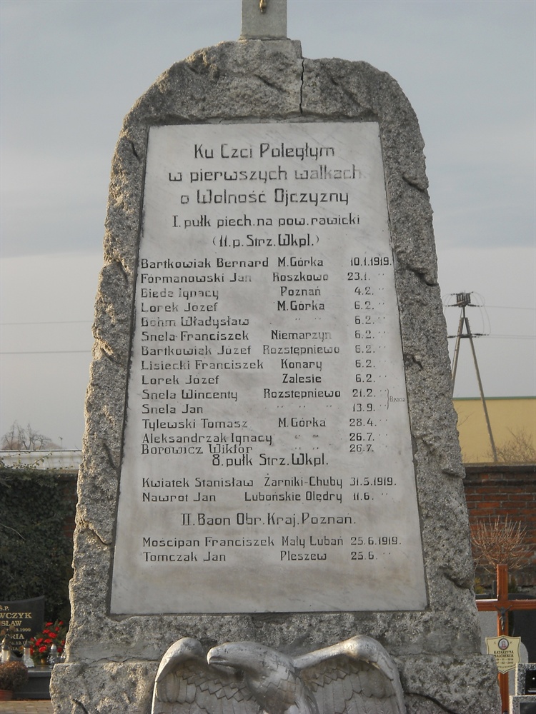 Na cmentarzu w Miejskiej Górce znajduje się pomnik poświęcony poległym żołnierzom w pierwszych walkach o wolność Ojczyzny w 1919 roku. Pomnik jest jakby zwieńczeniem mogiły. Na ogromnym kamieniu mieści się tablica pamiątkowa z nazwiskami 18 poległych. Podane są jednostki wojskowe, w których walczyli żołnierze. Pod tablicą widnieje sylwetka orła.