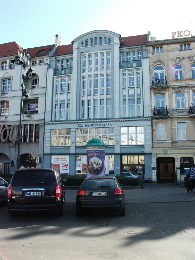 Chociaż w kamienicy mieści się dziś oddział banku Pekao SA, to fasada przypomina o jej pierwotnej funkcji.