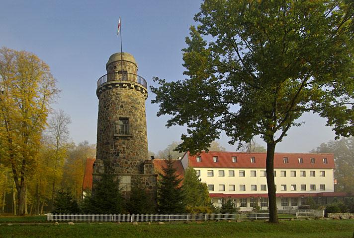 W roku 1899 Zarząd Związku Poległych Bojowników zainicjował budowę tej wieży. Na miejsce budowy wybrano ostródzki Park Miejski, bezpośrednio przy brzegu Jeziora Drwęckiego. Projekt wieży wykonał architekt budowlany z Ostródy Gruhl, który został również kierownikiem budowy. Wykonanie prac budowlanych powierzono C. Pondellowi, który wybudował tę 21-metrową wieżę z granitu. Kamień węgielny położono 01.04.1901. Uroczystego otwarcia wieży dokonano dokładnie rok później 01.04.1902. Koszt przedsięwzięcia wynosił 18.000 marek. Na kwadratowej podwalinie wieży (6,5 x 6,5 m) wznosiła się okrągła wieża z misą ogniową. Przez przylegający do wieży ceglany holl wejściowy (6 x 5,5 x 4 m) z szerokimi półkolistymi otworami dostać się było można do wewnętrznych schodów drewnianych, które przez trzy piętra prowadziły do platformy widokowej. Na pierwszym piętrze znajdowało się wyjście na okolony dach hollu wejściowego (przybudówka). Na drugim piętrze można było wyjść na balkony od strony południowej i zachodniej. Dalej żelazną drabiną było można się dostać do misy ogniowej z betonu. Do oświetlania wieży ogniem służyły szczapy drewna oraz płynna smoła i nafta. W późniejszym okresie do tego celu zaczęto używać drewnianych wiór i chrustu. Ogień na wieży rozpalano przynajmniej do 1905 roku, zawsze 1 kwietnia (urodziny Bismarcka). Na południowej ścianie podwaliny przymocowano kamień z piaskowca, na którym znajdowała się 1 metrowa płaskorzeźba Bismarcka z brązu. Około 1923 r. wieżę przebudowano po raz pierwszy (usunięto przybudówkę, wymieniono schody, usunięto balkony i krenelaże oraz misę ogniową). W roku 1993 Sieglinde Seele und Günter Kloss, autorzy książki "Bismarck-Türme und Bismarck-Säulen” ("Wieże i kolumny Bismarcka”), wyd. Michael Imhof, Petersberg 1997, zastali wieżę wyremontowaną, pozbawioną jednak medalionu Bismarcka i misy ogniowej.(michalolczak)