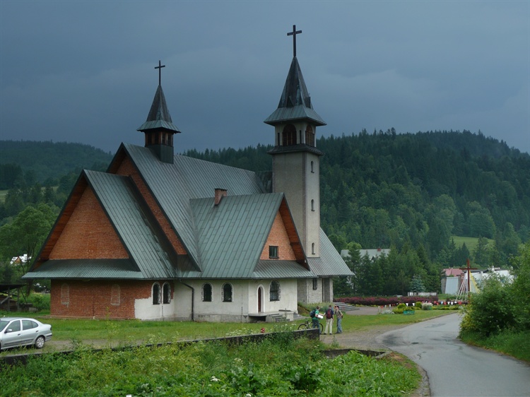 Kościół przypomina swoim kształtem inne góralskie świątynie. Jest murowany, jednonawowy, ze strzelistymi dachami. Ciekawostką jest fakt, że nie posiada witraży. Okna zdobią żelazne ramy kute.
