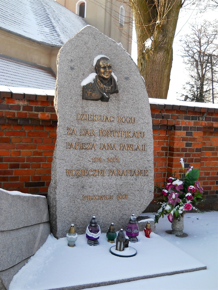 Przy kościele pw. św. Marcina w Wilkowicach znajduje się pomnik Jana Pawła II ufundowany w 2008 roku przez parafian. Na płycie mieści się płaskorzeźba z popiersiem Ojca Świętego, a pod nią napis: "Dziękując Bogu za dar pontyfikatu Papieża Jana Pawła II, 1978-2005 - Wdzięczni parafianie, Wilkowice 2008".