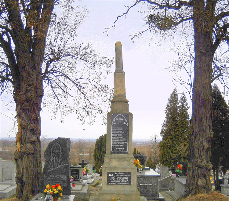 W kulminacyjnym punkcie cmentarza mieści się kamienny krzyż wotywny postawiony w tym miejscu jako dopełnienie intencji Jana i Zofii Tarnowskich. Ich intencją była działalność na rzecz ubogich i potrzebujących w podzięce za cudowne ocalenie Zofii z choroby. Krzyż wzniesiono z woli Gabryeli z Małachowskich hr. Tarnowskiej. Na cokole umieszczony jest fragment homilii św. Jana Chryzostoma. Jednak czas i wiatr uszkodziły krzyż, który wygląda obecnie jak kolumna.