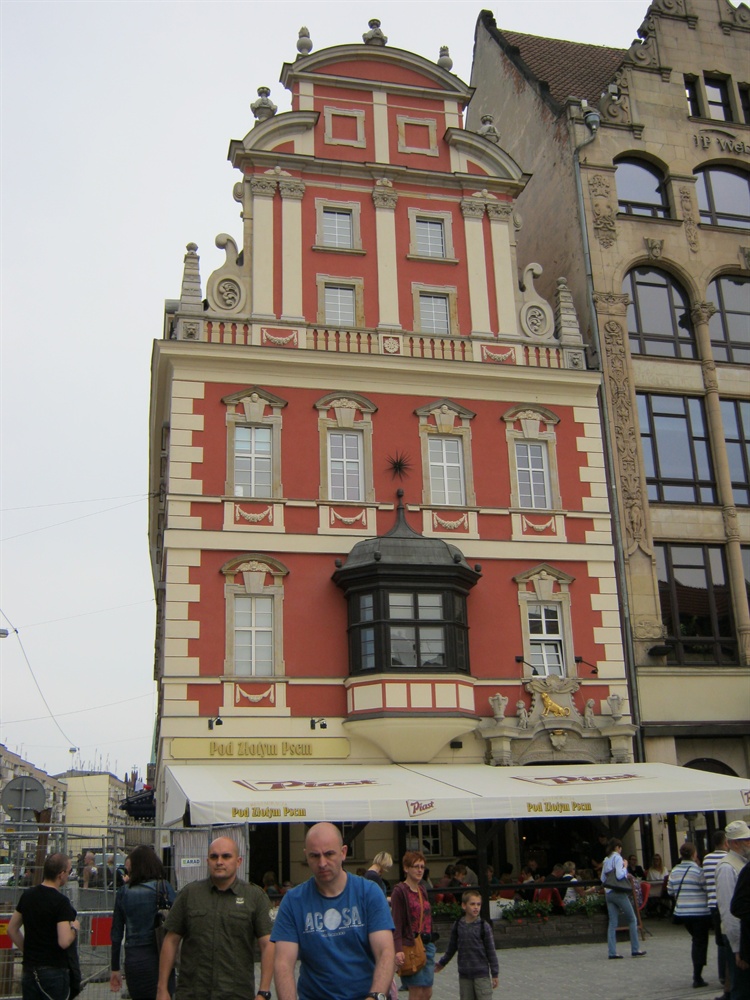 Dom Pod Złotym Psem znajduje się we wschodniej pierzei rynku pod numerem 41. Pierwsze wzmianki o kamienicy sięgają 1562 roku. W 1713 roku została gruntownie przebudowana w stylu barokowym według projektu architekta Jana Jerzego Kalckbrennera. W 1730 roku otrzymała portal z kolumnami i godło „Złotego Psa”. W czasie wojny została poważnie uszkodzona, a następnie rozebrana. W 1994 roku została zrekonstruowana. Orginalne godło barokowe z kamienicy jest przechowywane w Muzeum Architektury we Wrocławiu.