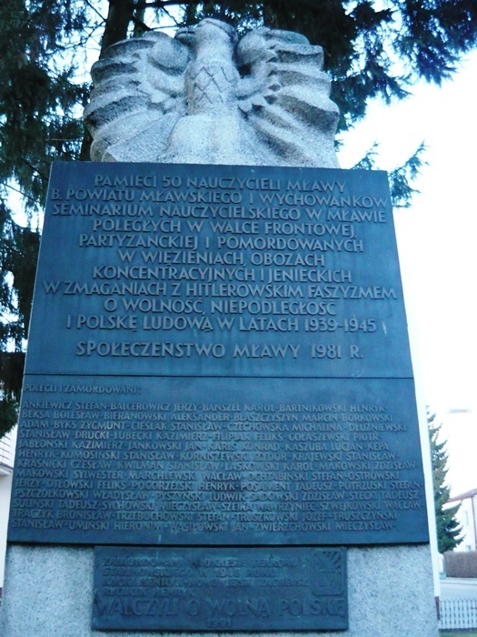 Pomnik upamiętniający mławskich nauczycieli pomordowanych w czasie II wojny światowej postawiono w 1981 roku na placu przy ulicy Reymonta, tuż obok Parku Miejskiego i siedziby Powiatowego Ośrodka Szkolenia Nauczycieli. Pomnik ma kształt kolumny, na szczycie króluje orzeł, dolną przestrzeń wypełniają dwie duże tablice i jedna mniejsza umieszczona najniżej. Górna opatrzona jest napisem: „Pomnik upamiętniający 50 nauczycieli byłego powiatu mławskiego i wychowanków seminarium nauczycielskiego poległych w walce frontowej, partyzanckiej i pomordowanych w więzieniach, obozach koncentracyjnych i jenieckich, w zmaganiach z hitlerowskim faszyzmem o wolność, niepodległość i Polskę Ludową w latach 1939-1945. Społeczeństwo Mławy 1981”, na drugiej zaś wymienione są imiona poległych i zabitych. Ostatnia tablica wspomina zamordowanych w okresie terroru stalinowskiego w 1946 roku: Kąckiego Henryka, Nowowiejskiego Zacheusza i Rychcika Henryka, którzy walczyli o wolną Polskę; pochodzi z 1991 roku.