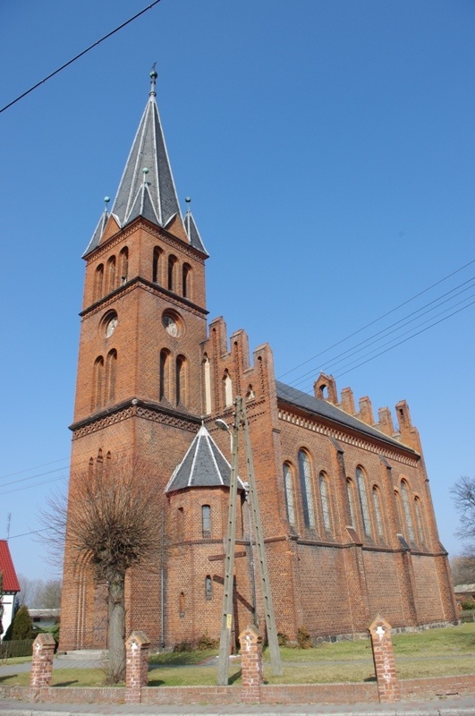 Neogotycki poewangelicki kościół pw. Przemienienia Pańskiego zbudowany w 1880 roku z czerwonej cegły, z fundacji Ericha von Tiedemanna. Poświęcenia kościoła dokonał dnia 6 sierpnia 1880 roku dr Wiesman z Munster, wuj fundatora. Przebudowany w latach 1922-1926 według projektu właściciela wsi Ericha Tiedemanna. W 1984 roku przeołowiono okna i naprawiono witraże (w pracowni pani Kośnickiej w Poznaniu). W kościele zachowały się dwa żeliwne piece z początku XX wieku.