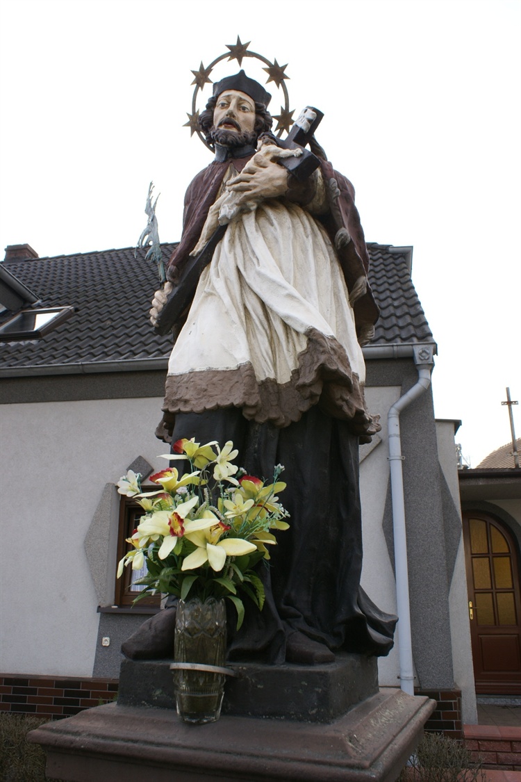 Kamienia barokowa rzeźba św. Jana Nepomucena została wykonana w 1719 lub - według innych źródeł - w 1741 roku. Święty, stojący na dwustrefowym cokole, przedstawiony jest w tradycyjnym stroju z aureolą nad głową. W rękach trzyma krzyż, a w prawej dłoni dodatkowo gałązkę palmy - symbol męczeństwa. Rzeźba została ufundowana przez kanonika Józefa, hrabiego na Tęczynie.
