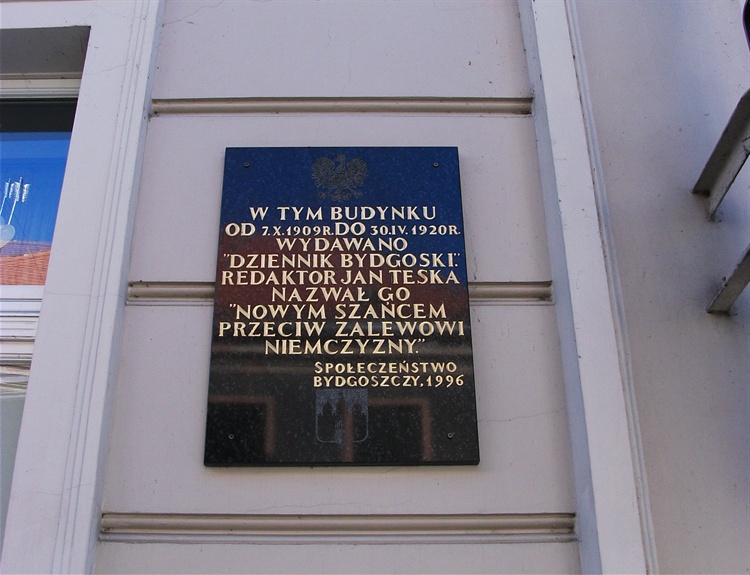 Pamięć o dawnej drukarni i "Dzienniku Bydgoskim" utrwala okolicznościowa tablica na ścianie kamienicy.