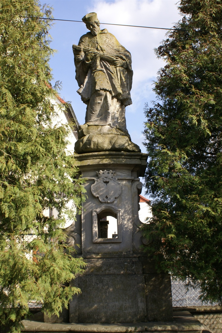 Przed kościołem św. Trójcy znajduje się barokowa rzeźba św. Jana Nepomucena. W cokole pomnika mieści się ozdobne okienko przeznaczone na światło umarłych. Nad okienkiem u stóp świętego umiejscowiono tarcze herbowe.