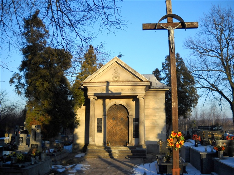 Na parafialnym cmentarzu znajduje się neoklasycystyczny grobowiec rodziny Dolańskich, zbudowany według projektu Tadeusza Stryjeńskiego w roku 1931. W tympanonie, nad wejściem widniej herb Dolańskich - Korab.