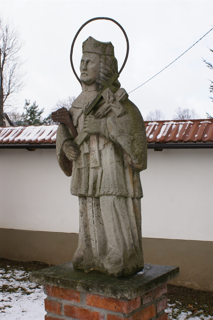 Na terenie przykościelnym przy murze znajduje się nietypowa figura św. Jana. Święty - krępej budowy, w tradycyjnym stroju - stoi na postumencie wykonanym z cegły. Do piersi przytula krucyfiks i palmę. Nad głową przykrytą biretem mieści się rzadko spotykana bezgwiezdna aureola.