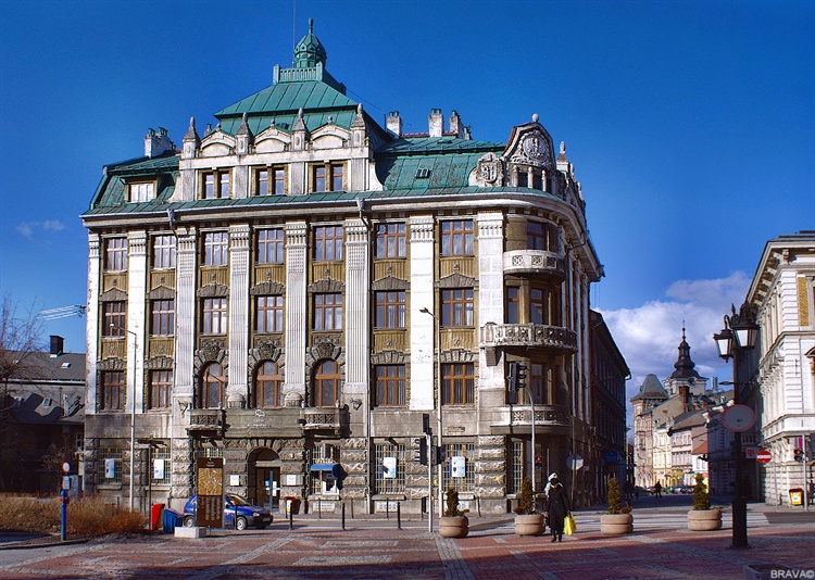 Całość pokryto mansardowym dachem z wieżyczką widokową. Jego zwieńczenie - w zaokrąglonym narożniku kamienicy - ozdobiono Białym Orłem i dwoma tarczami herbu Bielska-Białej. Ta interesująca budowla wkomponowana jest w ciąg zabytkowych kamienic otaczających plac przeobrażony z XIX-wiecznego Świńskiego Targu na Plac Ratuszowy stanowiący jeden z centralnych punktów miasta.