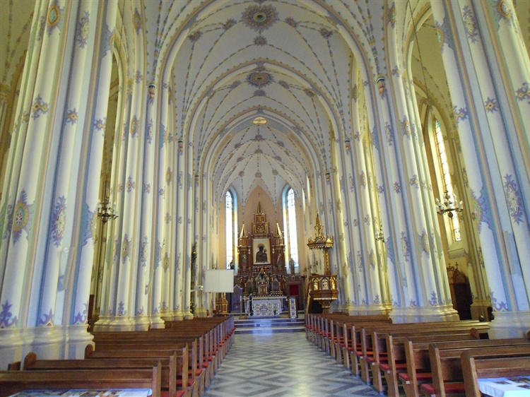 Autorem obecnego, murowanego kościoła był architekt Stefan Szyller. Krótko po ukończeniu budowy wojska rosyjskie wycofujące się przed Niemcami podpaliły świątynię i wysadziły wieżę kościelną. Kościól odbudowano juz w 1920 r. W neogotyckim ołtarzu głównym, warto zwrócić uwagę na kopię obrazu Matki Boskiej Jasnogórskiej. Godny uwagi jest także przenośny ołtarzyk, zwany feretronem z XVIII w., używany w czasie procesji.