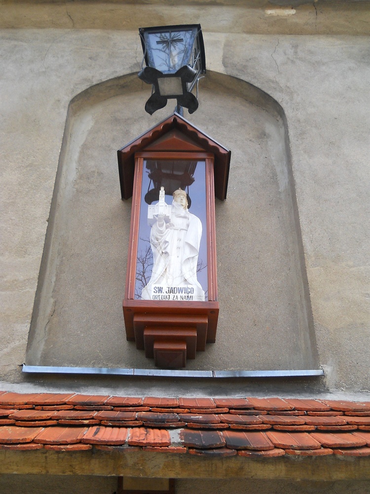 Nad głównym wejściem do kościoła w Brennie znajduje się kapliczka z figurą św. Jadwigi Śląskiej z Trzebnicy - patronki tutejszego kościoła. Wyrzeźbiona została z drewna starej lipy rosnącej naprzeciw głównego wejścia do kościoła w roku 2008 przez Romana Jazdona z pobliskiego Wijewa. Kapliczkę, w której umieszczona jest drewniana postać św. Jadwigi wykonał mistrz stolarski z Brenna - Brunon Firlej.